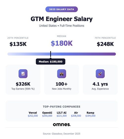 According to Glassdoor, GTM Engineers earn between $135,000 and $248,000 per year in the United States, with a median around $180,000. Top-paying companies like Vercel ($252,000), OpenAI ($250,000), and LILT AI ($221,500) offer premium compensation.
